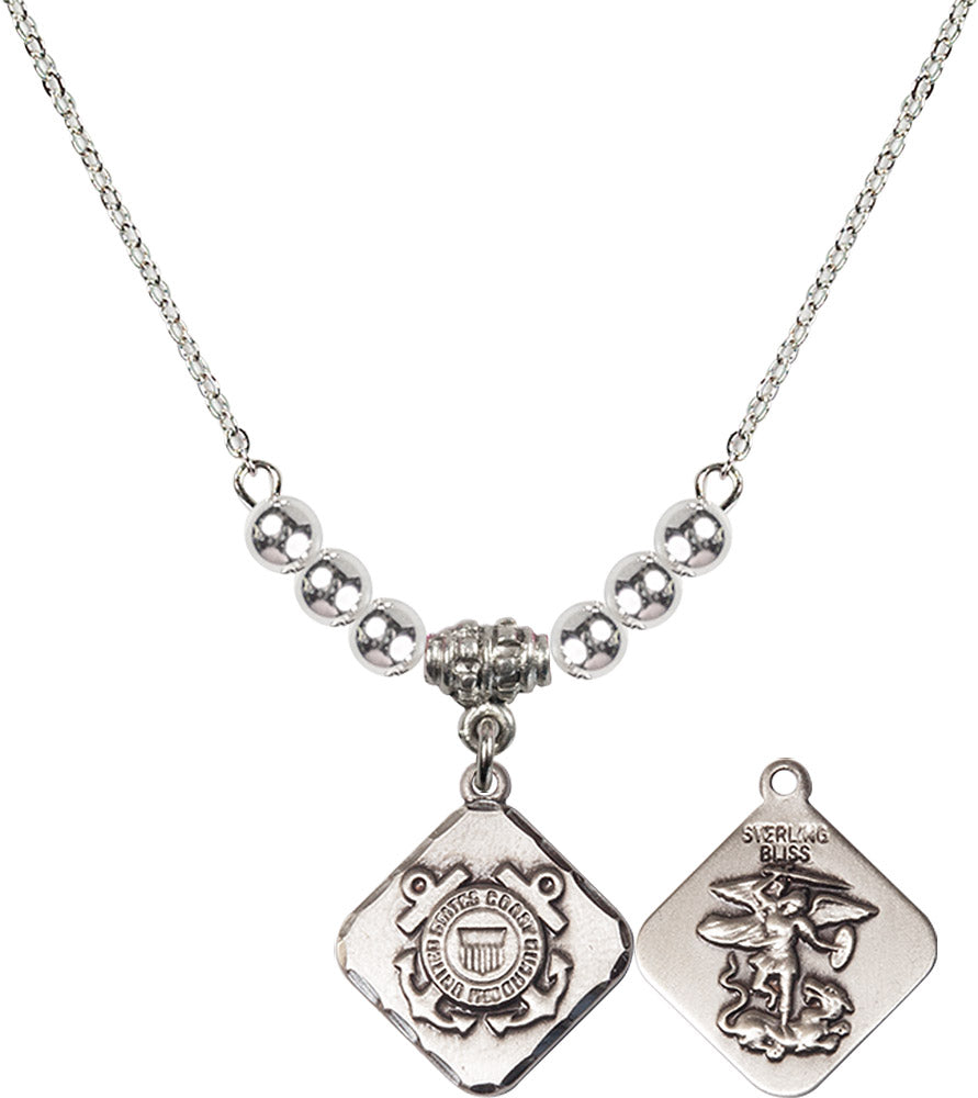 18-Inch Rhodium Plated Necklace with 4mm Sterling Silver Beads and Coast Guard Diamond Charm.