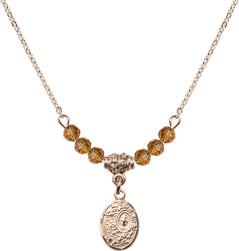 18-Inch Hamilton Gold Plated Necklace with 4mm Topaz Birthstone Beads and Miraculous Charm.