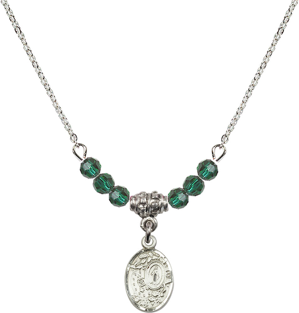 18-Inch Rhodium Plated Necklace with 4mm Emerald Birthstone Beads and Miraculous Charm.