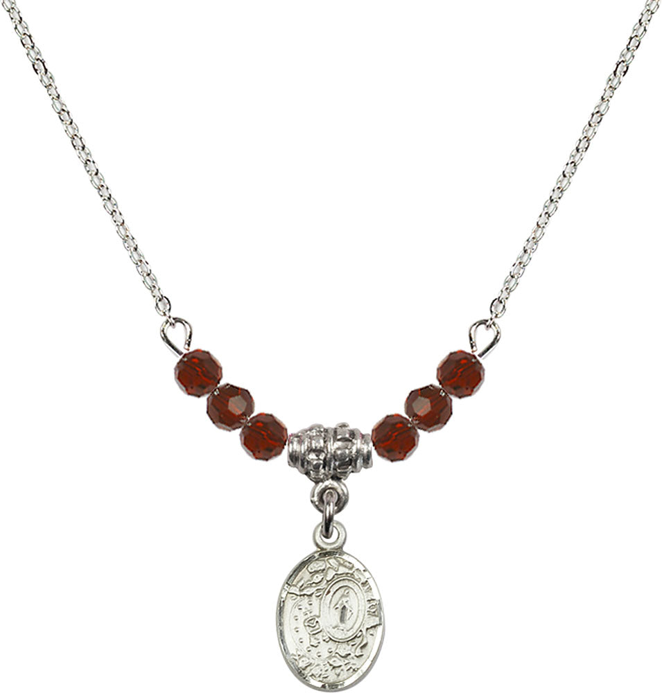 18-Inch Rhodium Plated Necklace with 4mm Garnet Birthstone Beads and Miraculous Charm.