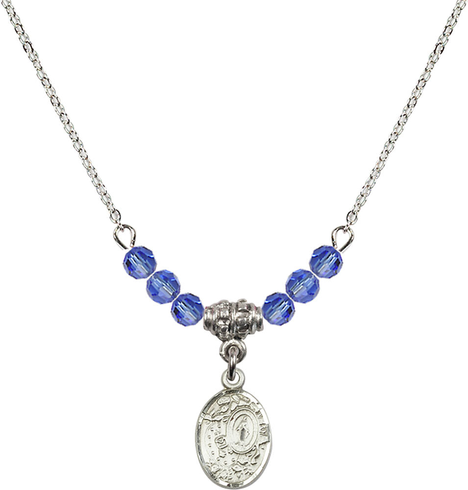 18-Inch Rhodium Plated Necklace with 4mm Sapphire Birthstone Beads and Miraculous Charm.